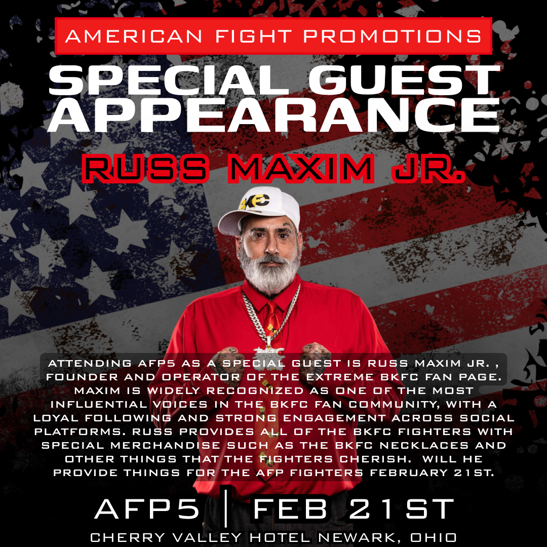 Read more +12 February 2026 By kring.michelle@gmail.com in NEWSOn Facebook American Fight Promotions is proud to welcome Russ Maxim Jr. to AFP 5! Known nationwide as the founder of the Extreme BKFC fan page, Russ Maxim Jr. has become one of the most recognized and respected voices in combat sports media. On February 21 in Newark, Ohio, he’ll be cageside for an